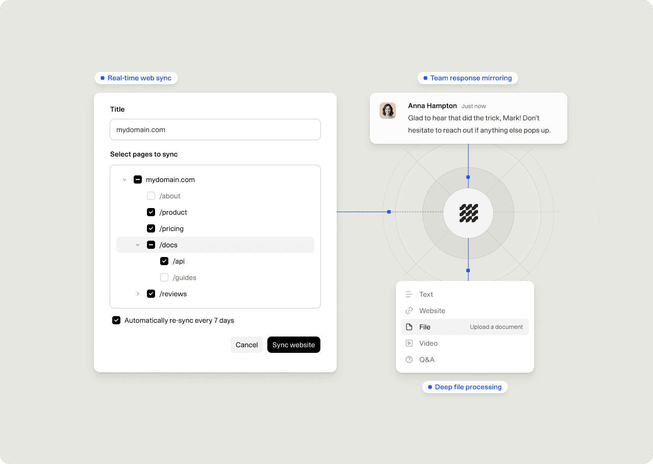The answers already exist. Often the answer is just scattered across docs, tools, and people. It's slow to access, inconsistent to deliver, and impossible to scale. Most customer support teams try to fix this with more docs, tools and support teammates. And for a while, that works.