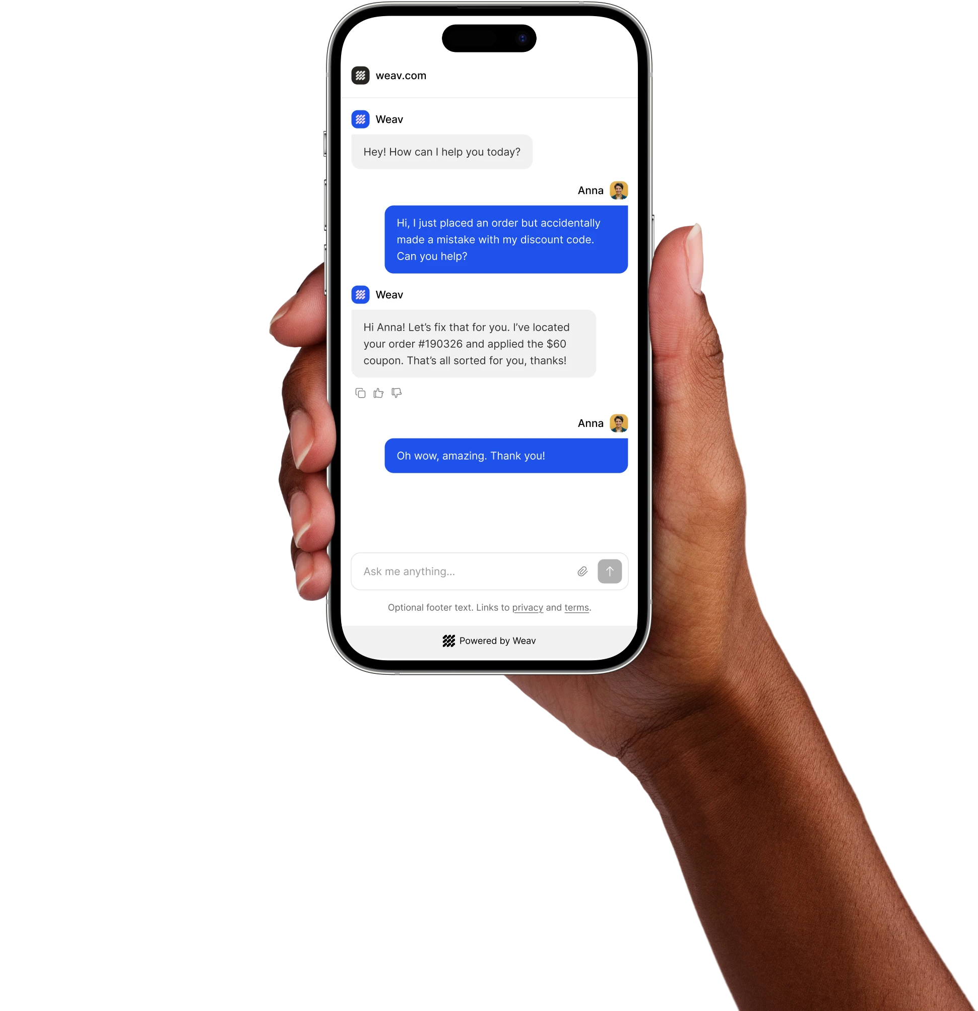 Add your training content, adjust the tone, and let Weav sound like your best employee on their best day.